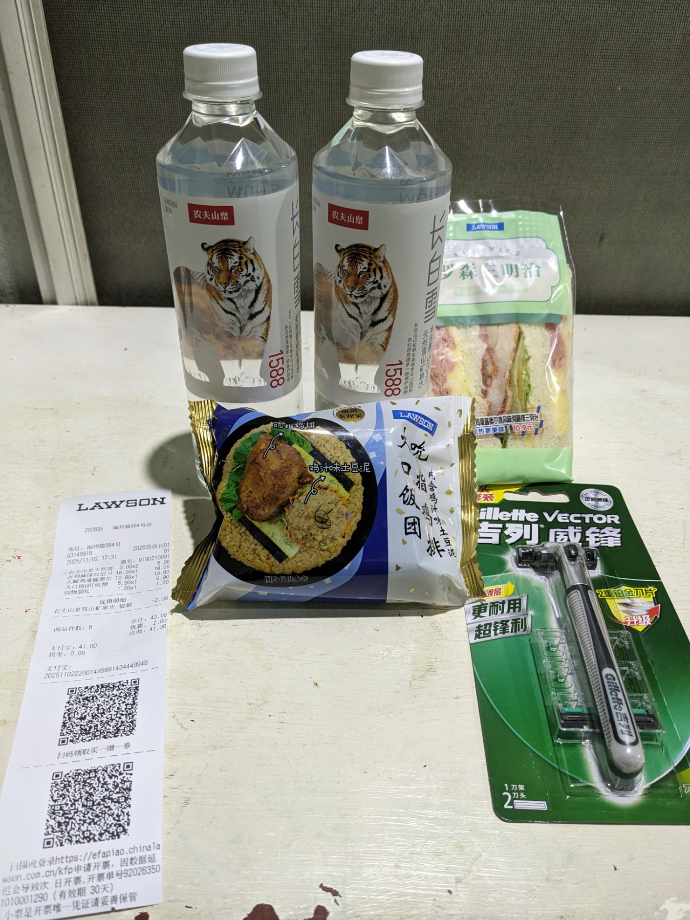 ローソンで朝食と昼食を購入。「現金が使えるか?」と訊いたら「使える」との返事。焼き鳥お握り6.9元152円(日本のお握りの約2倍)、サンドイッチ8.9元196円、ソーセージパン6.9元152円、(いずれもローソンブランド)、豆乳コーヒー味(パンとセットで約40円割引で2元44円)で計25.7元約568円。
